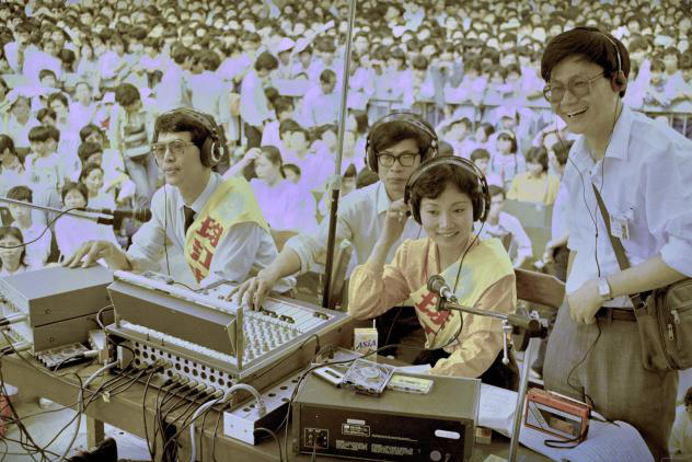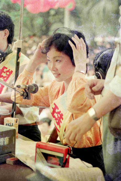 1987年5月1日,珠江经济台在广州文化公园露天中心舞台首次公开直播,赵彦红正在整理耳麦。(来源:《光影——南方报人75年镜头实录》)