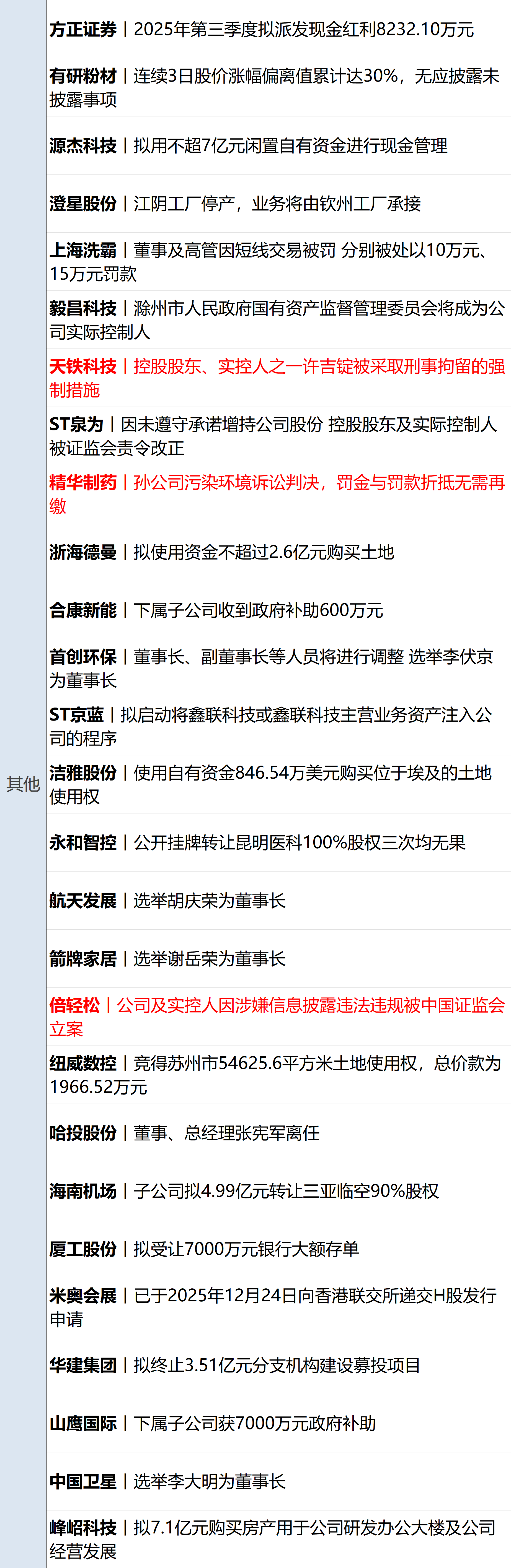 水井坊(SH600779,股价39.80元,市值194.03亿元):12月25日午后,A股白酒板块震荡走高,其中水井坊涨停,报39.80元/股,引发投资者广泛关注。市场还传出“剑南春拟收购水井坊”的消息。水井坊12月25日晚间公告,25日,公司关注到有媒体报道称 “某酒企拟收购水井坊”,为避免相关市场传闻对社会各界和投资者造成误导, 现予以澄清说明。经公司核查,上述报道不属实。